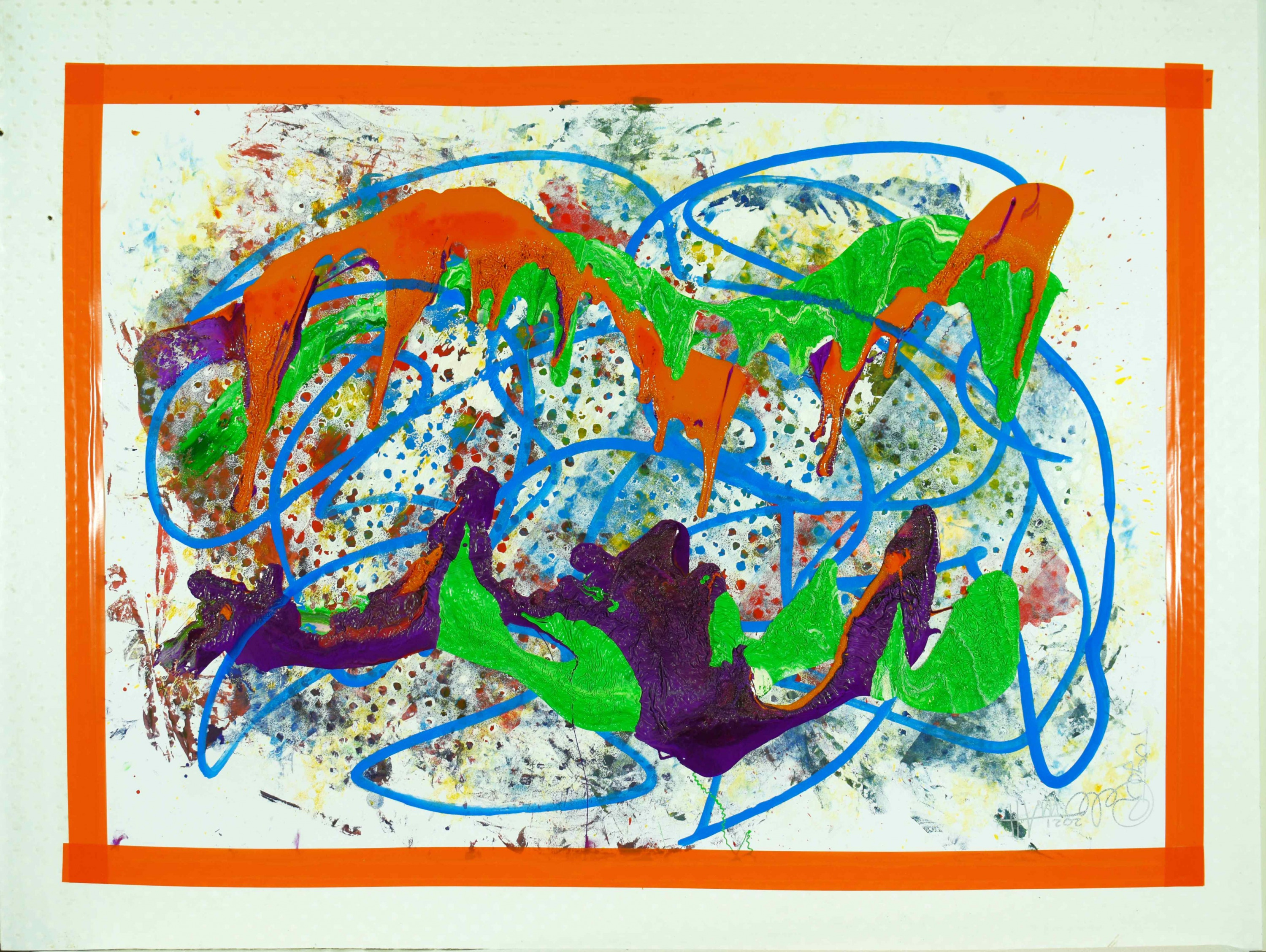 What goes around comes around ist ein mixed Media Bild das 2021 fertiggestellt wurde. Auf einer 90x120x1 cm Noppenstrukturplatte aus Polypropylen, wurde mit 5 cm breitem orangen Klebeband ein 70x100 Papierbogen angebracht. Gemischte und verdünnte Farben sind fleckig im hintergrund Aufgeragen, die mit einem lochstruckturroller mit weissem Gesso übermatl ist. Wilde blaue Linien, cirka einen Finger breit, überschneiden sich mal rund, mal mit scharfen Ecken. In der oberen hälfte ist orange und grüne Farbe dick, leicht geschwungen, aufgetragen. Von links bis in die mitte und auf der rechten Seite fliesst die orange Farbe über die grüne Farbe und ab der Mitte fliesst die grüne über die orange Farbe. In der unteren Hälfte fliessen violette und grüne Farbe überschlungen nach oben. Die dick aufgetragenen Farben bilden auf ihrer obrefläche eine organsche wirkende Haut struktur. Unten links wird die blaue Linie aus dem Hintergrund über die violette Farbe geführt. Oben links kreuzt die blaue Line die orange Farbe und im oberen rechten viertel die grüne Farbe.